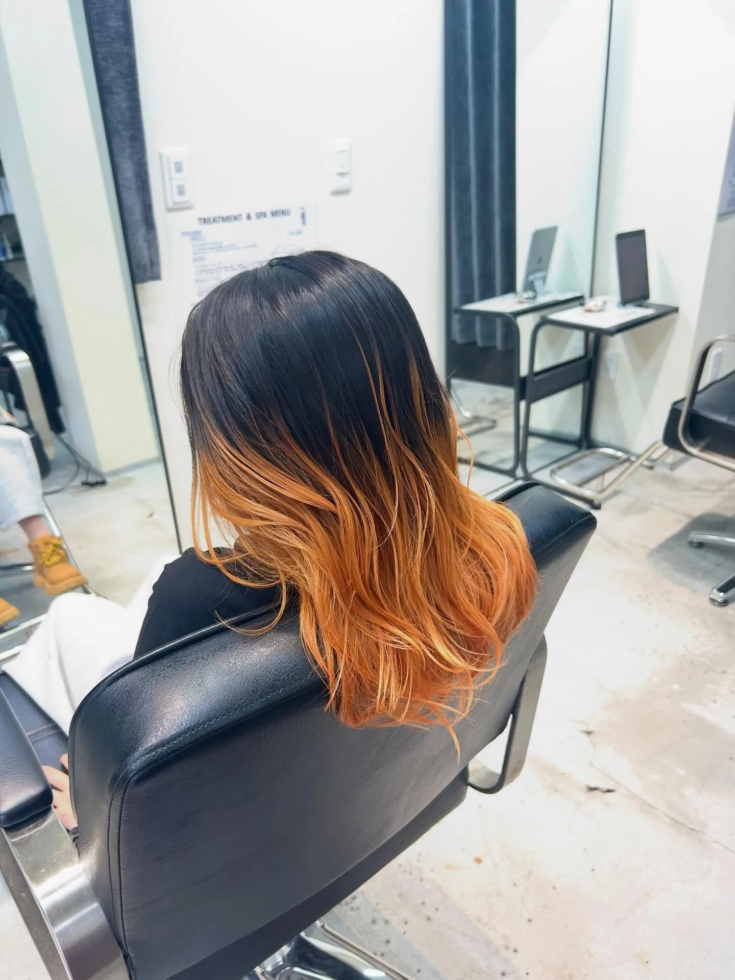 毛先はブリーチベースを活かしたビビッドなオレンジカラー。