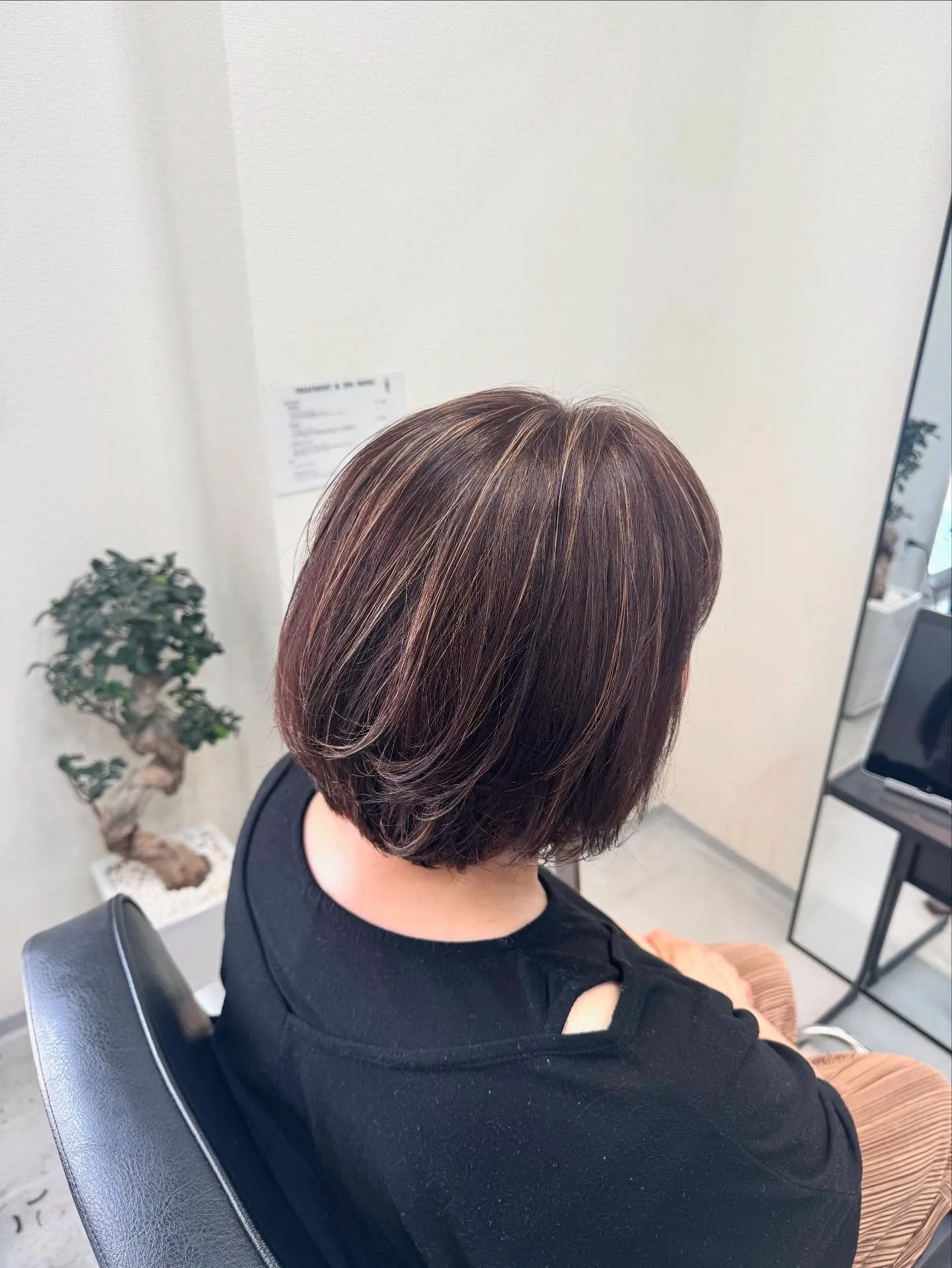 ボブにハイライト🤩 ボブにハイライト🤩頭の形、髪質に合わせて拘りのカット🙌ボブスタイルにハイライトを合わせて重く見えがちなスタイルに動きと軽やかさ🙆🏽白髪染めや白髪ぼかしにも可能です是非ご相談ください🙇🏽Salon1では…