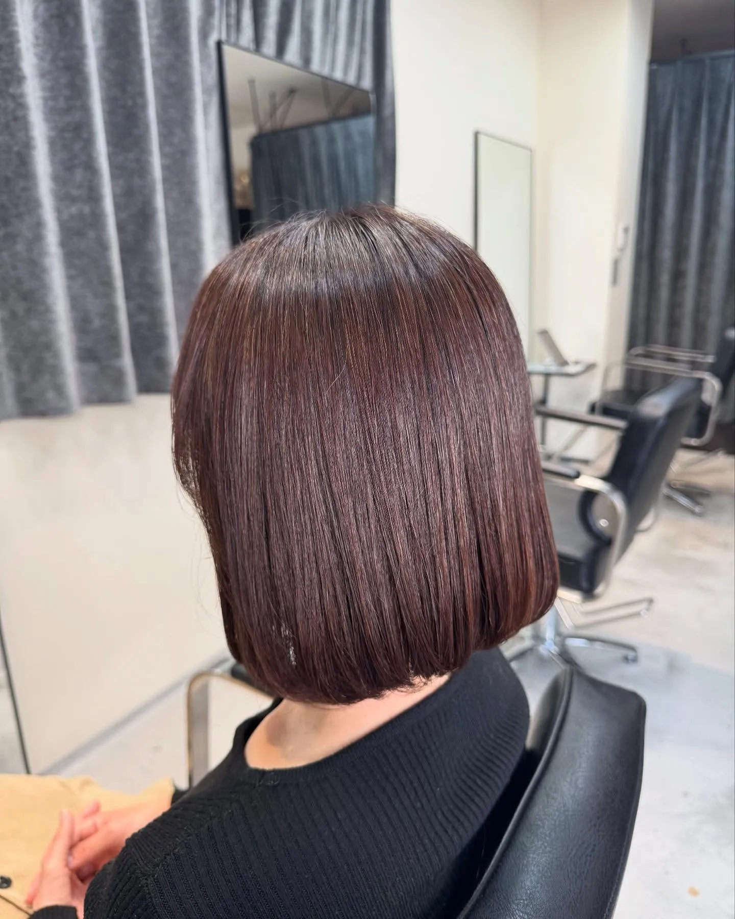 ビターブラウン🤎 ビターブラウン🤎暗めの落ち着いたビターブラウンで艶感もばっちり◎カットはプツッと感を残した切りっぱなしボブに♡肩で自然にはねる長さで普段のスタイリングもラクに決まります✂︎髪質に合わせたコタのシ…