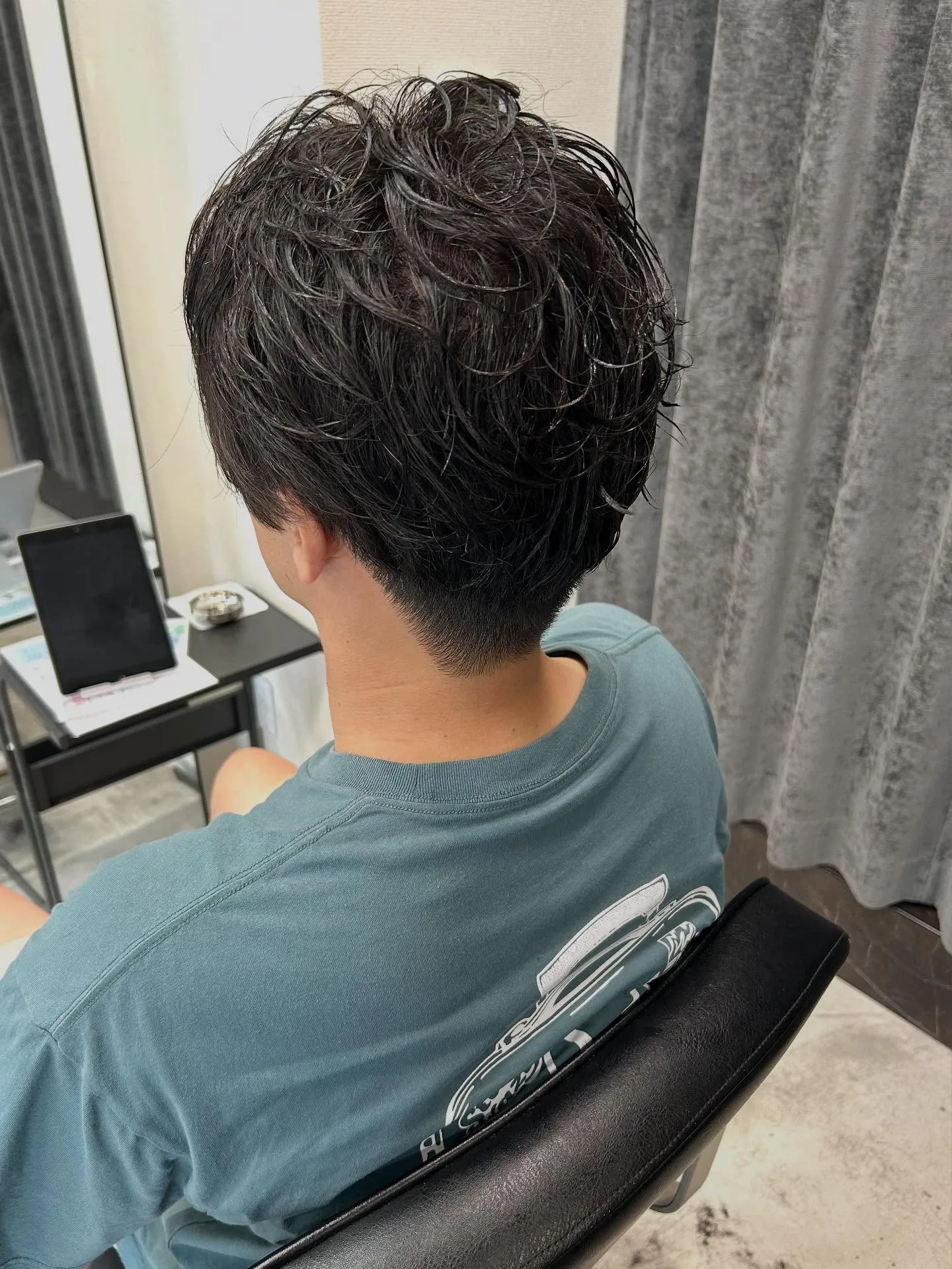 パーマをいかしたメンズショートサイドはツーブロック。襟足はグラデーション気味に刈り上げることで、後ろ姿もスッキリ。パーマがかかっている方でしたので、スタイリング剤を揉み込むだけで決まるよう…