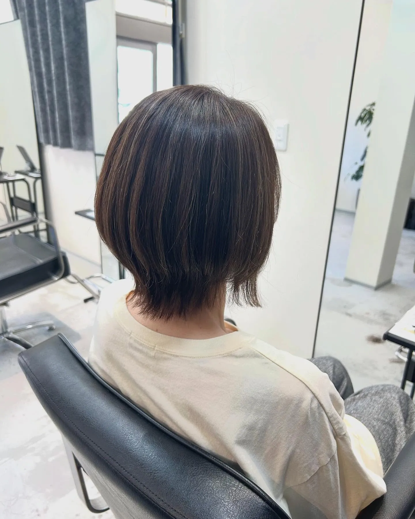 コンパクトショートボブひし形ショートボブでシルエットも綺麗に♡前回のハイライトを活かしてブラウンベージュで明るめに染めてあります🫧トリートメントでしっかり補修することでダメージ、艶、退色も変…
