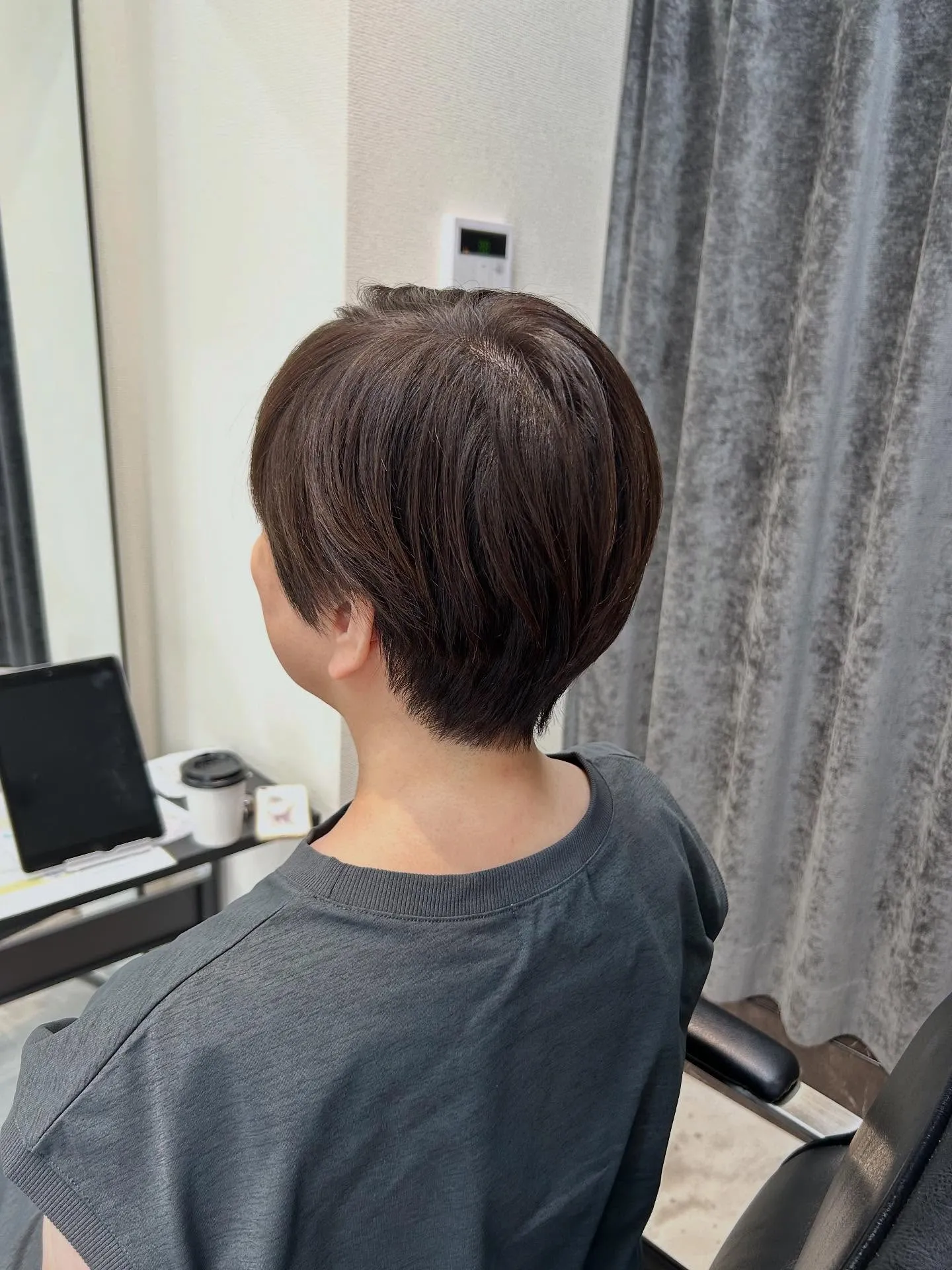 ナチュラルショート ナチュラルショート襟足はコンパクトに収めて、首元をスッキリ見せサイドとトップに自然な丸みを持たせて女性らしいシルエットにカラーは赤みを抑えたグレージュに髪質に合わせたコタのシャンプーを使用…