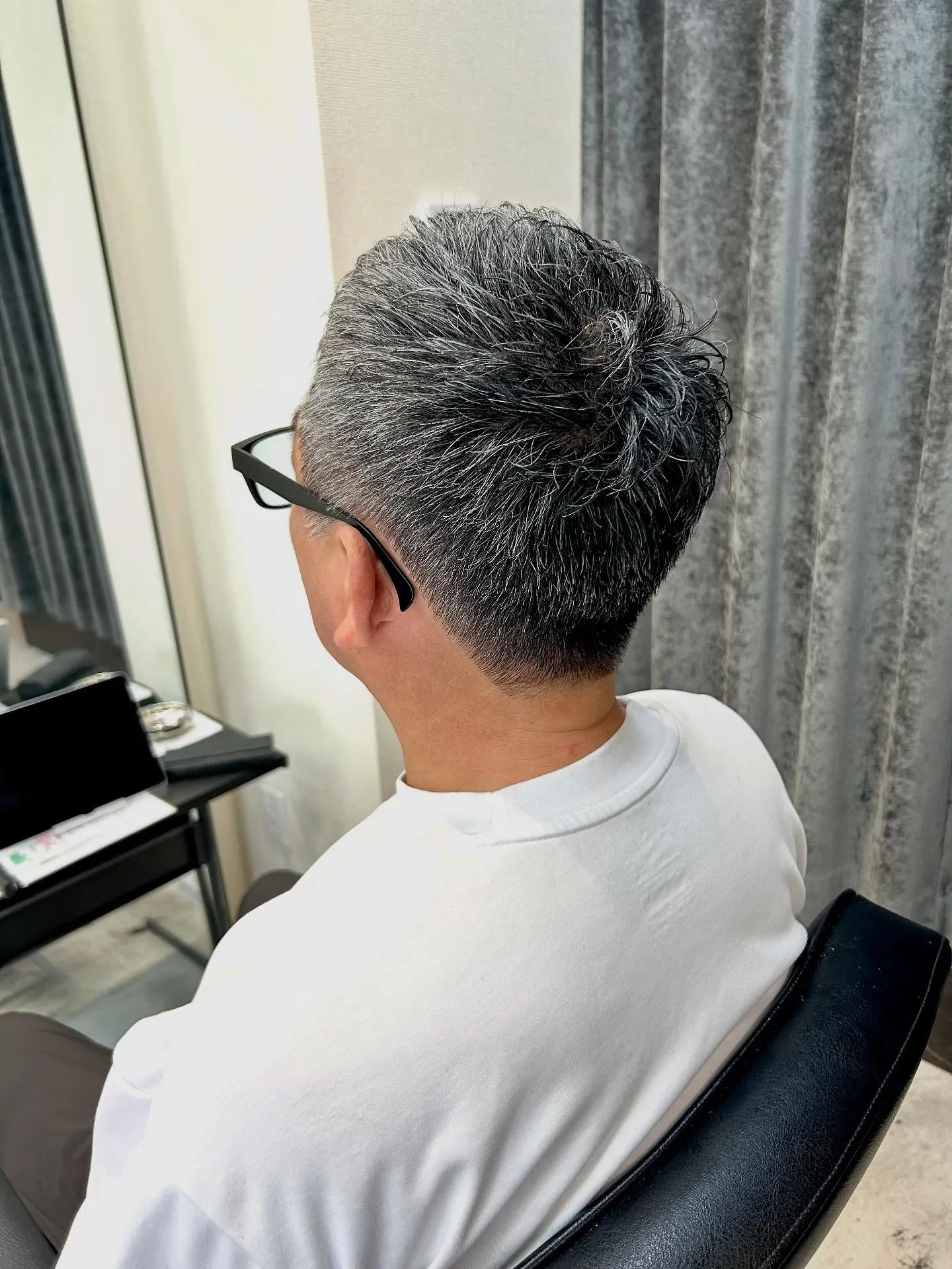 清潔感◎メンズショート 清潔感◎メンズショート白髪を隠すのではなく、あえてそのまま活かすことで、自然体で清潔感のある雰囲気に。刈り上げることでサイドや襟足がすっきりし、全体がシャープで若々しい印象になります✨️ヘッド…
